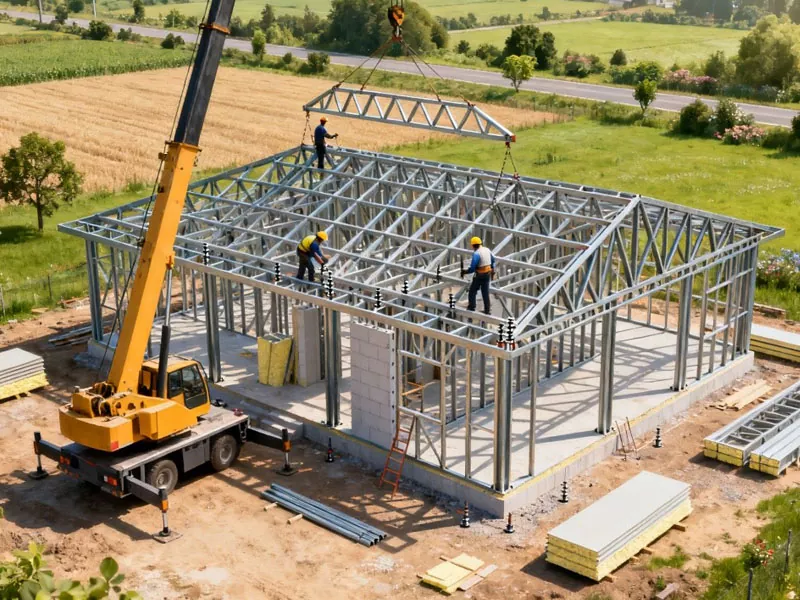 • Hausbau mit grüner StahlkonstruktionHausbau mit grüner Stahlkonstruktion