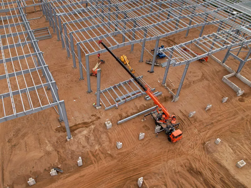 Die Stahlkomponenten, einschließlich Balken, Säulen, Zahnspangen und Dachbinder, sind in einer Werkseinstellung vorgefertigt. Es wird ein hochwertiger Stahl verwendet, und die Komponenten werden so hergestellt, dass sie genau und sicher zusammenpassen, um während der Installation genau und sicher zusammenzuarbeiten. Diese kontrollierte Umgebung ermöglicht strenge Qualitätskontrollmaßnahmen, um die Haltbarkeit und Zuverlässigkeit der Komponenten zu gewährleisten.